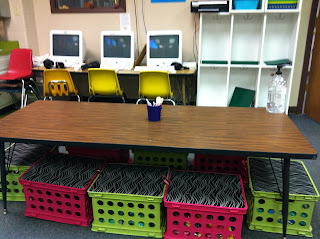 This is my teacher area. Notice how I don't have a teacher's desk in the middle of my room or even facing my students? I saw this idea on many, many blogs this summer - Get Rid of the Teacher Desk! Well, I didn't get rid of it completely, but I did shove it up against a wall. I mean, who has time to sit down at their desk during the day with 20+ kids in the room anyway?! More room for the kids!! I love this area for me and the extra room for the kids in front of the ActivBoard. Ignore the Target bag. Every time I go to work in my room on a non-school day I think I walk in with Target Dollar Section Goodies. Anybody with me?