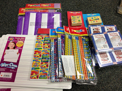 Of course, the Target Dollar section got attacked by me - as always! I found two purple small pocket charts, stamps, dry erase boards with primary writing lines (Daily 5 Word Work), pencils, stickers, and playing cards for math games.