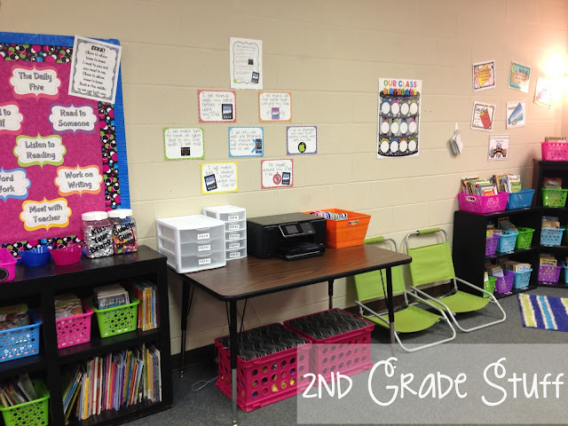 This table houses my 3 iPads and 5 iPod Touch devices along with my printer/scanner. I purchased this with my own money and it's so handy to make a copy of a parent note or if you run one short of something. I have Acceptable Use Policy Posters that give some rules for using the iPads/iPods posted above the table. They are FREE from Soaring Through Second Grade and can be found {HERE}. You can also see a couple of my crate seats and two fun beach chairs that the kiddos can sit in during different times throughout the day.
