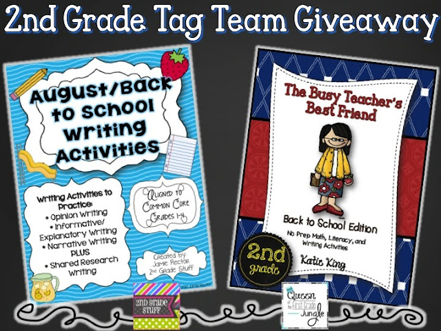 So to celebrate, we are offering you, no joke, the easiest giveaway in the blogging world!  We are tag teaming to give away a copy of her 2nd Grade Busy Teacher's Best Friend pack and a copy of my August/Back to School Common Core Writing Activities.  Katie's Busy Teacher pack is so useful for morning work, quick printables, homework, or even sub plans and I'm so happy she is now making them for 2nd grade!