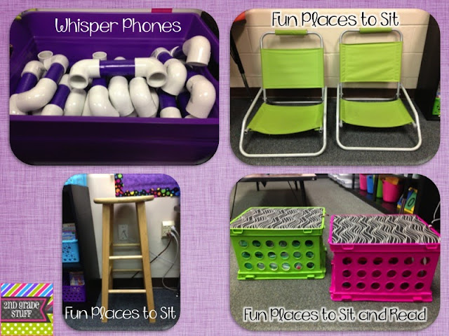 For Silent Reading, they have many places where they can sit. We have beach chairs, stools, crate seats, bean bags, rugs, etc. For some reason, it's just more fun to be sitting somewhere other than your desk when you're reading! I try to think about how I like to read. I am usually laying on the couch or in bed, so I think my students probably want to sit and read comfortably as well. So I am very flexible in their seating for Silent Reading. Many like to lay down under tables and such, which is fine by me as long as they're reading!