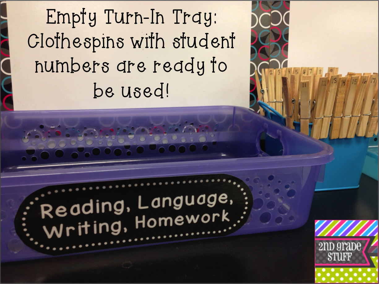 At the beginning of the year, I give each student a number. It is their number to remember all year long. It's their cubbie number, desk number, clip chart number, and best of all....their turn-in tray number! For the turn-in tray, I put their numbers on clothespins. Let me say, yes, I could have used Washi tape or dye or paint or cute little numbers for the clothespins, but I was going for FAST and EASY, my friends! This is what my turn-in tray looks like before student work is turned in: