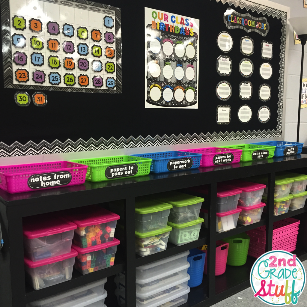 I've had a HUGE request for close-ups of these paper storage baskets and the labels on each. I have an entire blog post about how I organize my paper clutter using these baskets {HERE}. The labels are a FREE download from my sweet friend at Ladybug Teacher Files {HERE}. The baskets came from Really Good Stuff. The baskets are labeled Notes from Home, Papers to Pass out, Paperwork to Sort, Papers for Next Week, Extra Class Sets, and Extra Papers. You can read more about what actually goes in those baskets in the blog post linked above or {HERE}. The lime green and pink bins store my math manipulatives and came from Target several years ago. The buckets came from The Dollar Tree and the big storage container in the bottom right came from Big Lots. The calendar, birthday chart, and classroom jobs displays are from Creative Teaching Press.