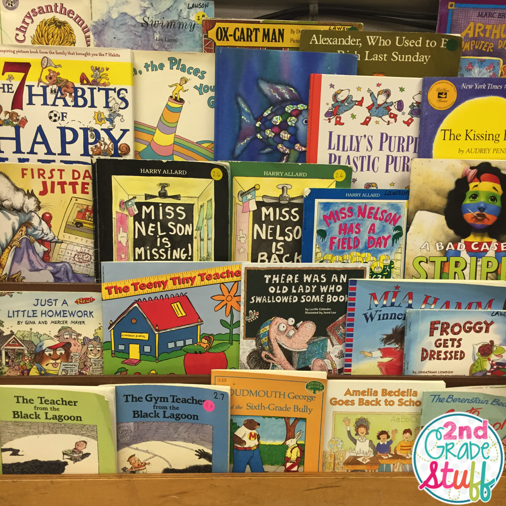 My picture book display case needs a serious paint job (I soooo need it to be black and probably will end up painting it before school starts Aug. 11th), but it's loaded with Back to School books for the first few weeks of school. I change these out monthly.