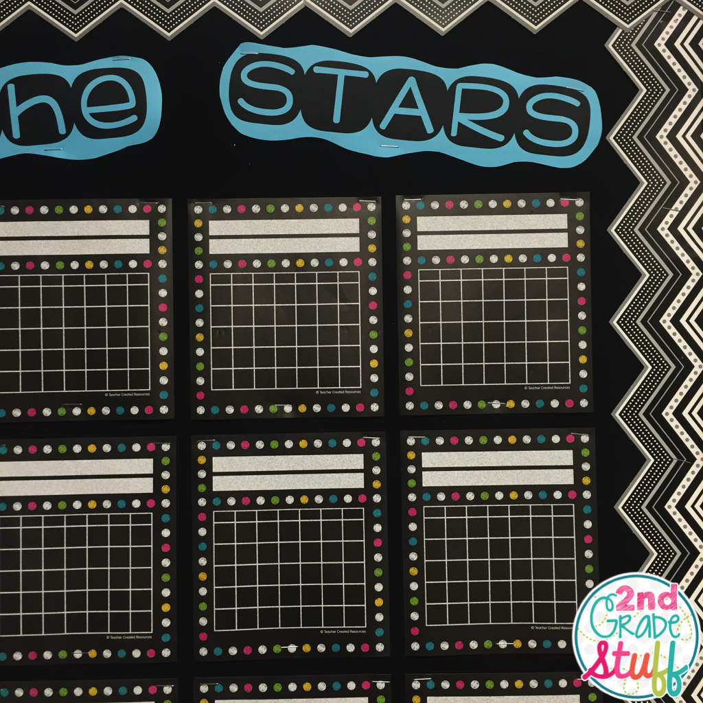 The "Reach for the Stars" headline was made from a font by Kimberly Geswein called KG Geronimo Blocks. It's a free download for personal use {HERE}. The incentive charts are from Teacher Created Resources. This will be used as my student data board.