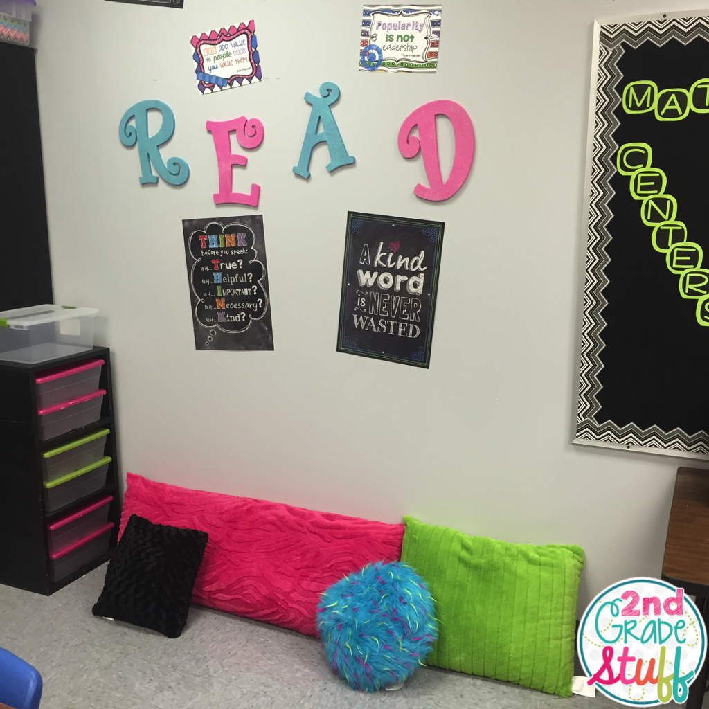 This is my small reading/relaxing area. All of the pillows came from Wal-Mart. The chalkboard posters came from Creative Teaching Press. The R.E.A.D. letters came from Hobby Lobby. Finally the smaller posters above with leadership quotes came from Lauren Bright at One Bright Classroom {HERE}.